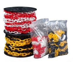 Absperrketten dienen zur individuellen Absperrung bestimmter Bereiche. Die Kette eignet sich hervorragend zur Anwendung mit Absperrpfosten. Wir bieten eine große Auswahl an Kunststoffketten aus Polyethylen zu attraktiven Preisen an. Unsere Kunststoffketten sind in den Farben Rot/Weiß, Gelb/Schwarz, Braun, Weiß und Schwarz erhältlich, in den Kettenstärken 3, 5, 6, 8 oder 10 mm. Ab einer Bestellmenge von 2000 Metern, können wir Ihnen die Kunststoffkette in Ihren Wunschfarben liefern.